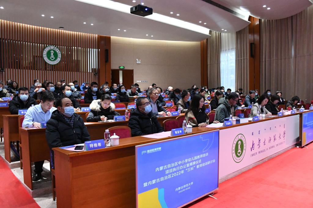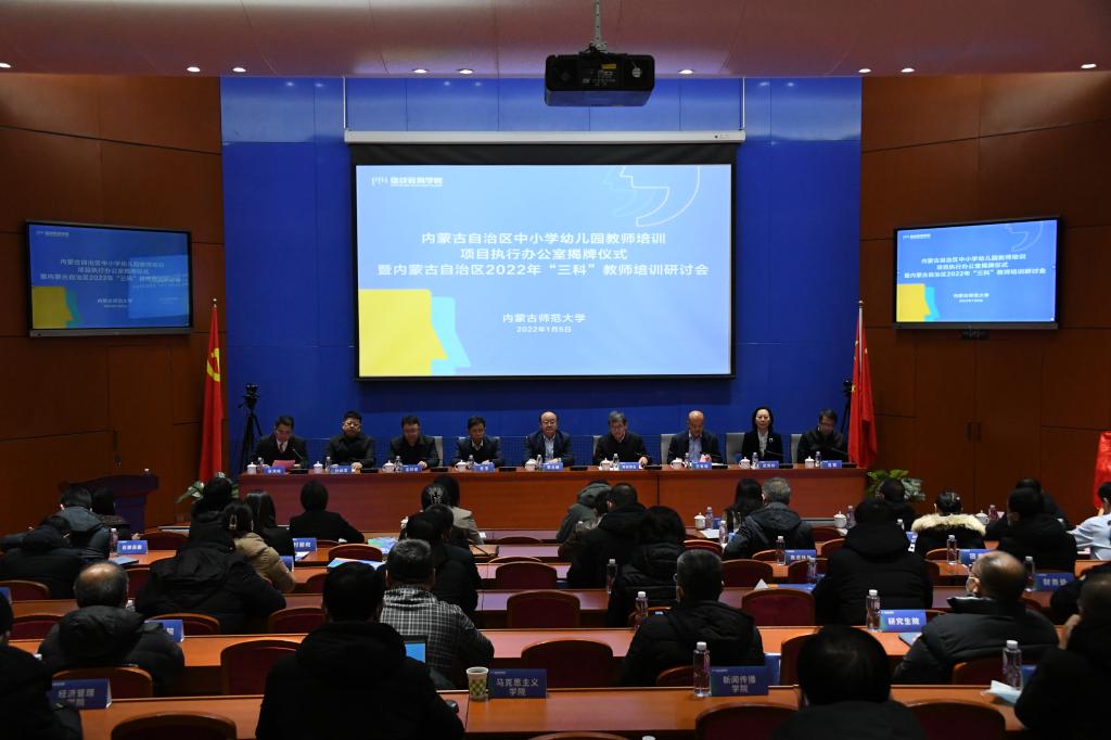 1月5日上午,内蒙古自治区中小学幼儿园教师培训项目执行办公室(以下简称“项目办”)揭牌仪式暨内蒙古自治区2022年“三科”教师培训研讨会在我校信息楼报告厅隆重举行。自治区党委教育工委委员、教育厅党组成员、副厅长李占峰,自治区教育厅教师工作处处长武秀珍、教研室主任孙柏军,内蒙古民族大学党委委员、副校长任军,包头师范学院党委委员、副校长王有亮,呼伦贝尔学院党委委员、副校长孟祥宏,赤峰学院、集宁师范学院yl6776永利集团负责同志,我校党委书记阿拉坦仓,副校长宫箭,各部门、各学院主要负责人以及yl6776永利集团全体教职工参加了会议。会议由我校党委委员、副校长张海峰主持。