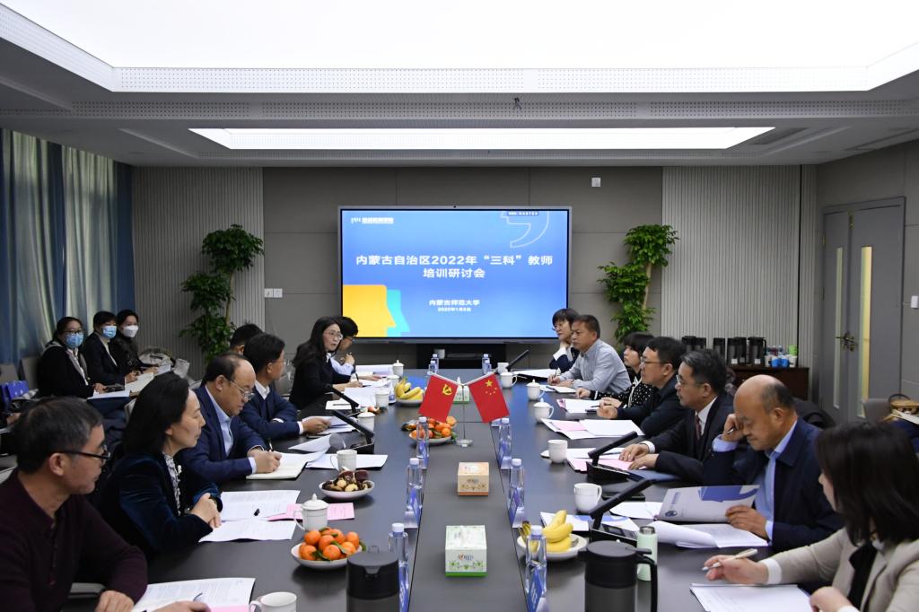 随后,在yl6776永利集团301会议室召开了内蒙古自治区2022年“三科”教师培训研讨会。内蒙古民族大学、6776永利集团、包头师范学院分别代表东中西部片区教师培训统筹单位发言,与会人员就2021年“三科”教师培训情况以及2022年的教师培训设想进行了交流和研讨。研讨会由张海峰主持,李占峰出席并讲话。