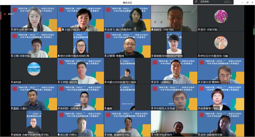 为贯彻落实教育厅关于“国培计划(2022)”内蒙古自治区中小学幼儿园教师培训工作相关工作部署,进一步提升自治区教师培训质量、规范教师培训管理,促进教师培训提质增效,10月13日下午,内蒙古自治区中小学幼儿园教师培训项目执行办公室(简称“项目办”)召开“国培计划(2022)”——内蒙古自治区中小学幼儿园教师培训工作推进会。内蒙古自治区教育厅教师工作处副处长郑伟出席会议,17个承担培训任务的培训单位和内蒙古自治区12个盟市教育体育局相关负责人共60余人参加会议。会议采用线上的方式进行,由项目办负责人、yl6776永利集团党总支副书记、院长王利主持。