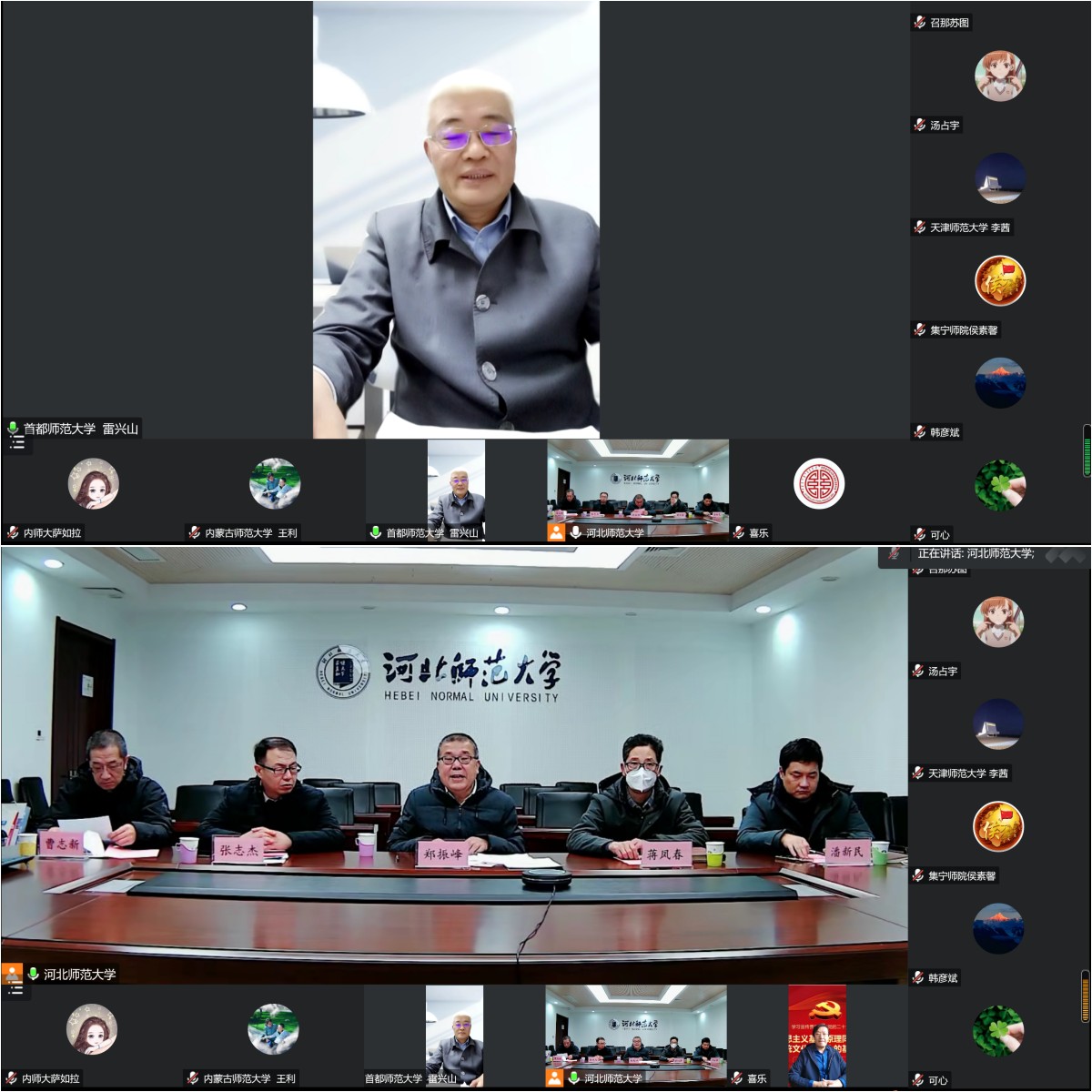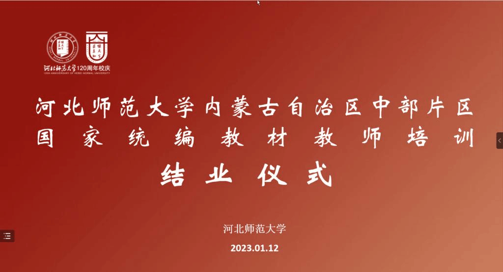 1月12日下午,由河北师范大学承办的内蒙古自治区中部片区乌兰察布市和锡林郭勒盟部分旗县的国家统编教材教师培训结业仪式在线举行,我校党委委员、副校长王来喜出席会议并讲话。出席本次结业仪式的中部片区协同高校的领导有首都师范大学党委常委、副校长雷兴山,天津师范大学党委常委、副校长佟德志,河北师范大学党委常委、副校长郑振峰。首都师范大学、天津师范大学、河北师范大学、集宁师范学院、乌兰察布市教育局、锡林郭勒盟教育局相关部门负责同志,我校yl6776永利集团领导班子,以及乌兰察布市、锡林郭勒盟的参训教师线上参加了结业仪式。