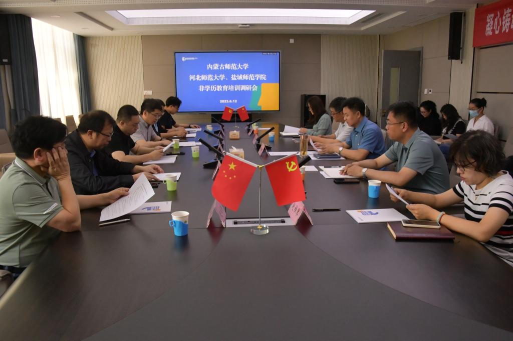 刘云剑介绍学院基本情况。付丽和介绍“国培计划”特色项目案例。河北师范大学和盐城师范学院相关学院负责人介绍非学历教育培训工作的现状。