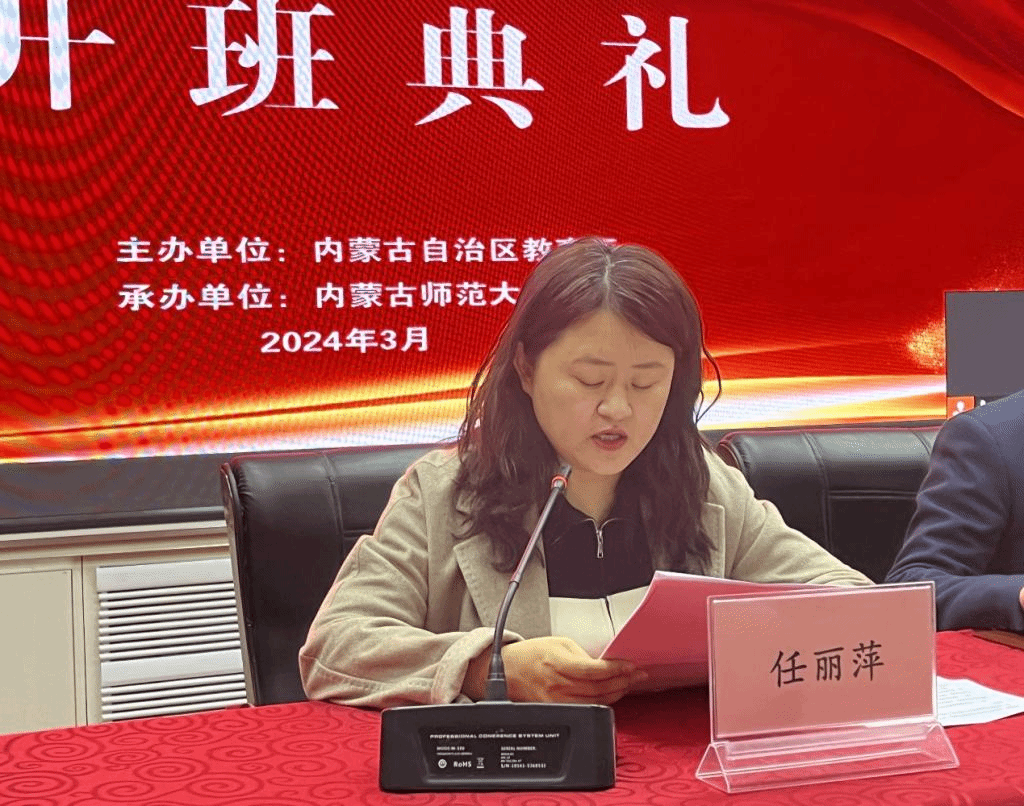 锡林郭勒盟正镶白旗第二中学王丽娜老师代表全体学员表态发言,表示定会珍惜本次学习机会,通过专家引领和同行交流,不断提高自身综合素质和业务专业水平,在教育教学中起到骨干带头作用,为当地的基础教育贡献智慧和力量。