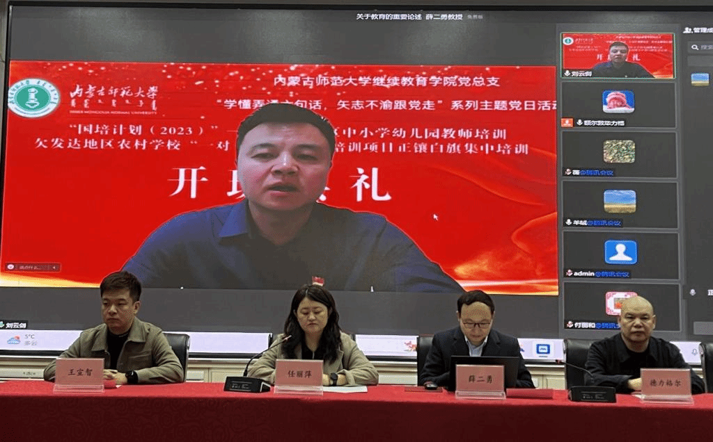 刘云剑副书记对“国培计划(2023)”——内蒙古自治区“一对一”精准帮扶培训项目的实施背景、宗旨意义、课程方案、专家聘请、培训环节、考核要求等做了详细说明。并且希望参训的老师,提高站位、端正培训态度,把所学所获运用到今后教育教学的具体实践,争做人民满意的“四有”好老师,努力践行教育家精神,办好人民满意的教育!