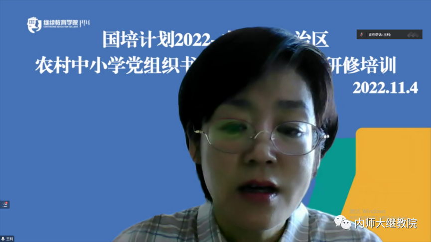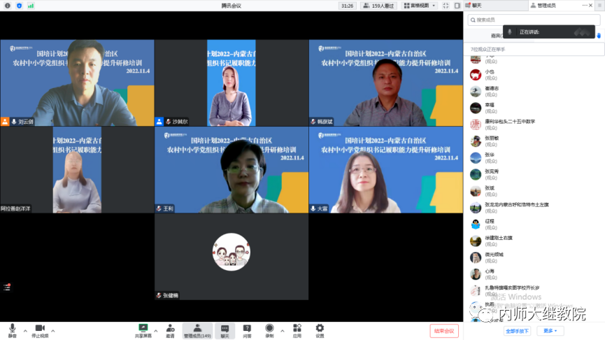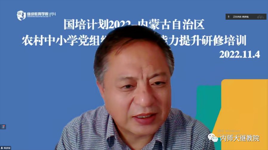 11月4日,由我校承办的“国培计划2022”——内蒙古自治区农村中小学党组织书记履职能力提升研修培训项目(初中组)通过线上形式开班。yl6776永利集团党总支书记韩彦斌,党总支副书记、院长王利,副院长付丽和,副院长召那苏图出席开班式。开班式由yl6776永利集团党总支副书记、副院长刘云剑主持,本次培训班班主任及150名来自各盟市的初中党组织书记参加了开班式。