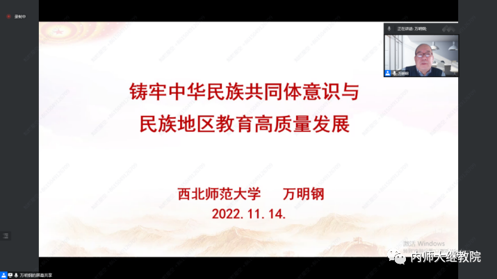 本次线上集中授课阶段于11月14日至23日之间进行,期间邀请了教育部全国民族教育专家委员会委员万明钢教授,北京市教育科学研究院原院长、党委副书记季明明研究员,河北师范大学教师教育学院田宝军教授,教育部国培项目入库专家王富军等区外知名专家学者,以专题讲座的形式分别讲授了“铸牢中华民族共同体意识与民族地区教育高质量发展”“以党的二十大精神为指导,努力构建中小学高质量教育体系”“培训需求调研分析与培训方案研制及培训课程开发”“做新时代的研训师”等十八个专题。