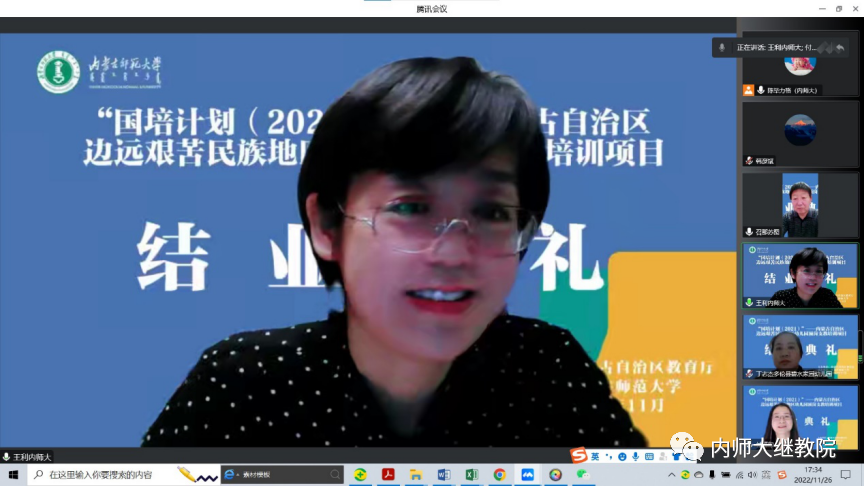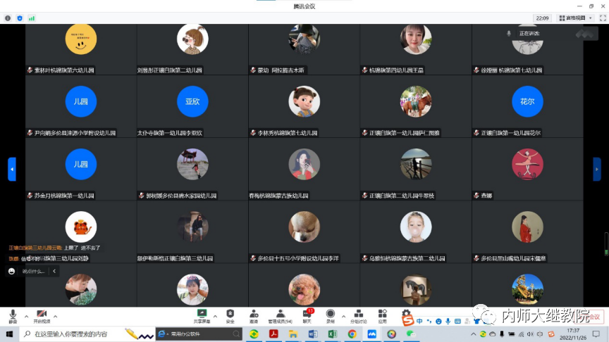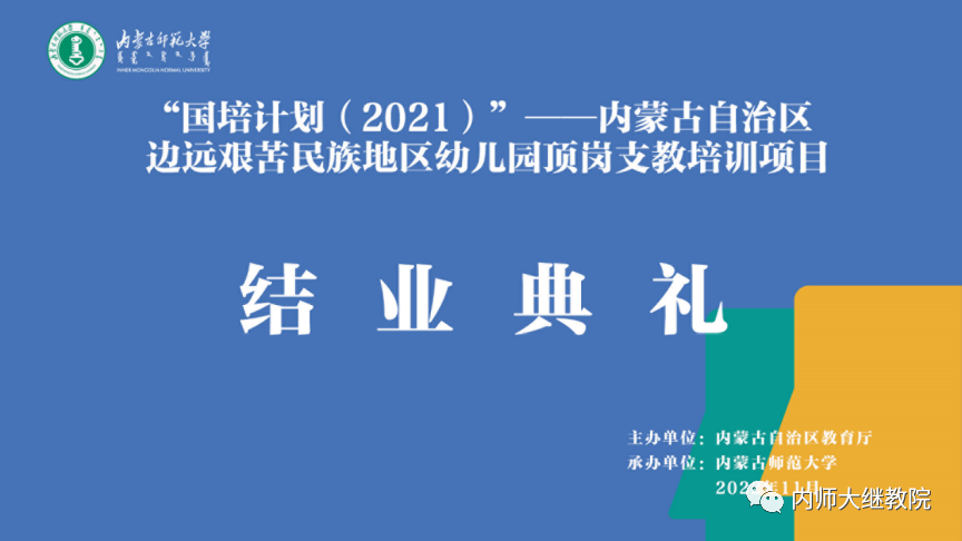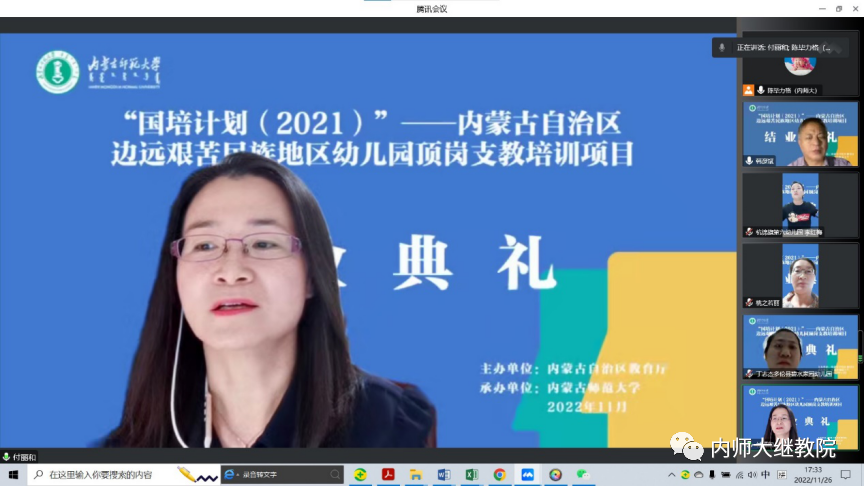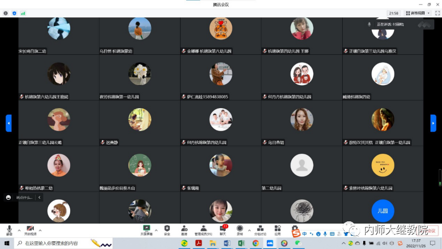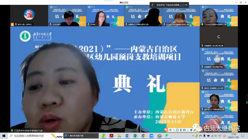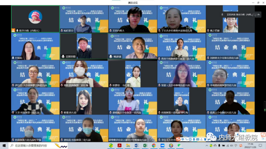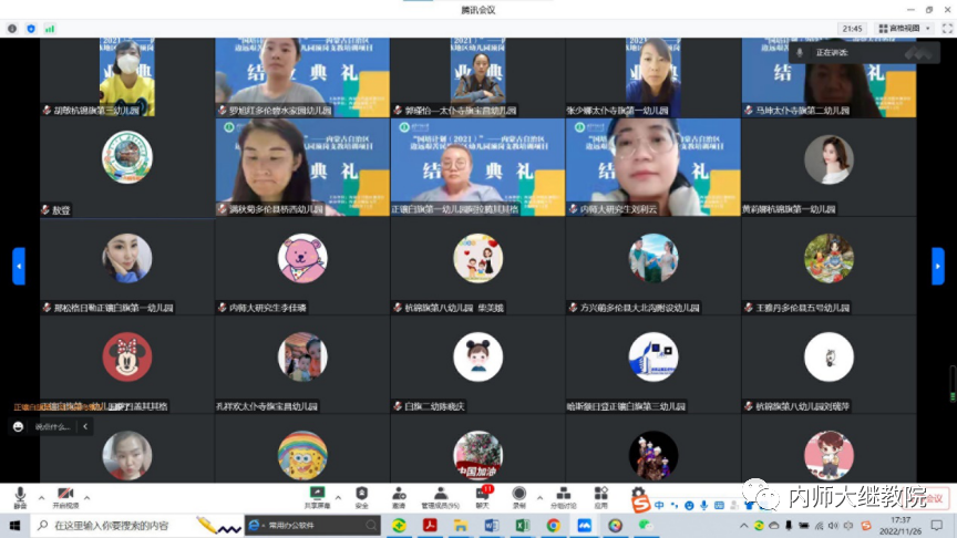 11月26日下午,由自治区教育厅主办、我校yl6776永利集团具体组织实施的“国培计划(2021)”——内蒙古自治区边远艰苦民族地区幼儿园顶岗支教培训项目在线上举行了结业典礼,至此该项目顺利结束。yl6776永利集团党总支书记韩彦斌,党总支副书记、院长王利,党总支副书记、副院长刘云剑,副院长召那苏图,三位班主任高丽桃、陈毕力格、敖登以及锡林郭勒盟多伦县、太仆寺旗、镶白旗、鄂尔多斯市杭锦旗的99名幼儿园教师参加了结业典礼。