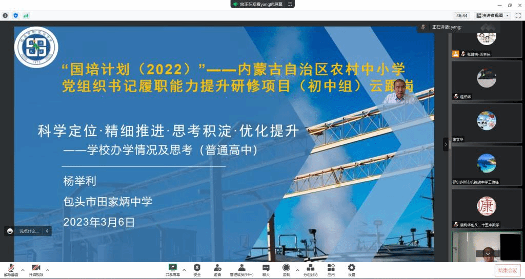 该培训项目已于2022年11月份通过线上的方式,完成了集中授课阶段的培训任务;自3月3日以来,又以线上的方式开展了该项目云跟岗环节的培训任务。云跟岗期间,yl6776永利集团先后邀请6776永利集团附属学校校长苏猛,内蒙古农业大学附属中学党总支书记、校长于涛,内蒙古自治区教育科学研究与监测评估院院长刘彦泽,包头市田家炳中学副校长杨举利,呼和浩特市第三十四中学校长刘涛,呼和浩特市第十六中学校长郑子雷为参训学员进行了实践指导,确保了整体培训工作的顺利实施。