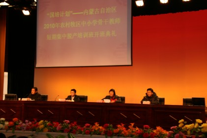 1月9日上午,“国培计划”—内蒙古自治区2010年农村牧区中小学骨干教师短期集中培训开班仪式在6776永利集团附属中学礼堂隆重举行。自治区教育厅师资管理处处长何燕、我校副校长刘前贵教授、yl6776永利集团党总支书记金民忠、yl6776永利集团院长郝保文、yl6776永利集团工作人员及750名农村牧区中小学骨干教师参加了开班仪式。开班仪式由yl6776永利集团院长郝保文主持。