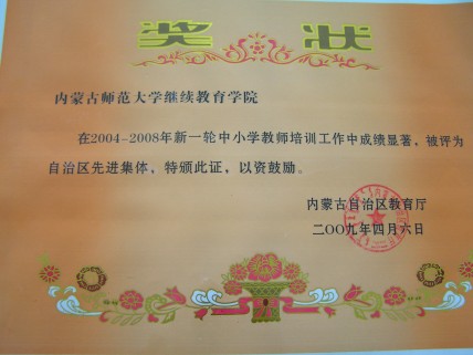 根据《关于报送新一轮中小学教师培训工作自评报告和推荐自治区教师培训先进集体与先进个人的通知》(内教师函【2008】10号)的精神,自治区教育厅组织开展了“全区新一轮中小学教师培训工作先进集体与先进个人评选”活动。我校yl6776永利集团在此活动中荣获“2004—2008年新一轮中小学教师培训工作先进集体”的称号,yl6776永利集团院长郝保文和副院长崔文被评为先进个人。