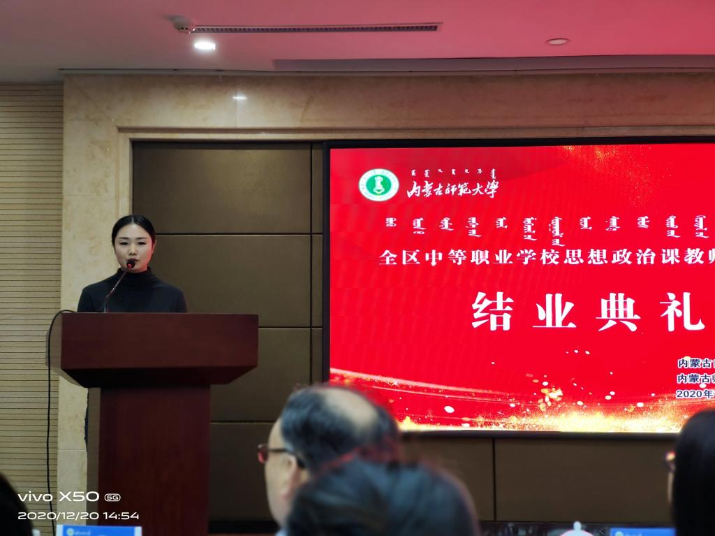 自治区教育厅职业教育与成人教育处赵美玲老师出席结业典礼并讲话,对本次培训班给予了充分认可,并对参加本次培训班的全体学员提出了三点希望,一是要提高政治素养,提高政治站位;二是要进一步按照国家课程标准提高教育教学能力;三是要多参加比赛和活动锻炼自己,提升自己。