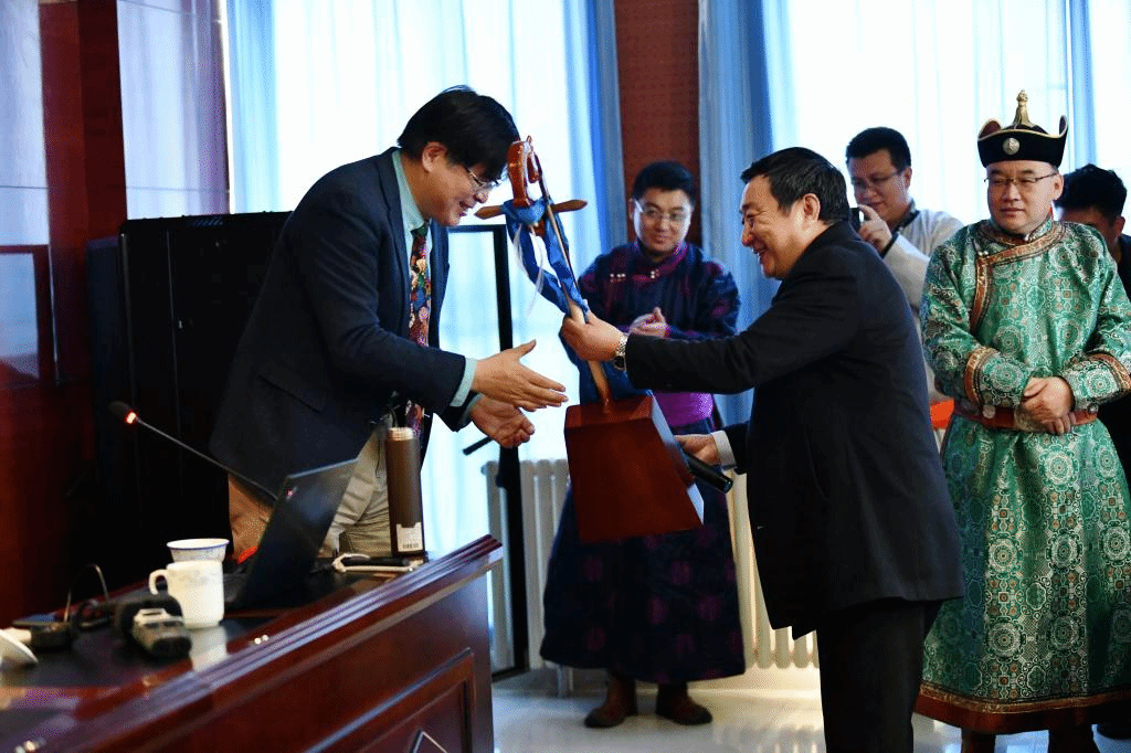 最后,呼和浩特市蒙古族学校校长白巴图将一架马头琴作为草原人民的问候赠予岳晓东教授,希望岳博士常回家讲学,为家乡的教育事业再作贡献。